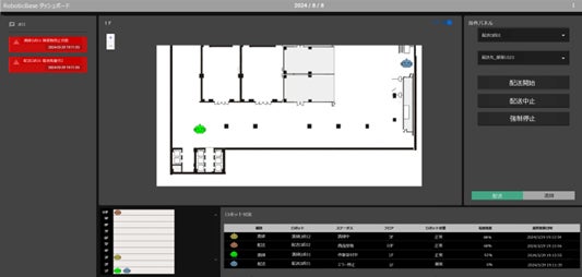 ■ 各ロボットの稼働状況は一元管理され、どこからでも確認可能。清掃、配送、配膳・下膳業務のほか、案内や警備等の様々なサービスロボットを接続し、将来の有効活用の幅を拡張