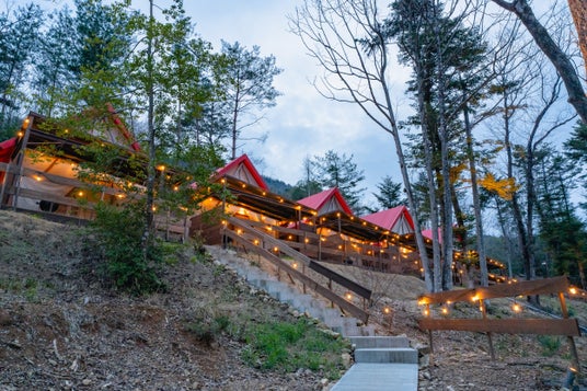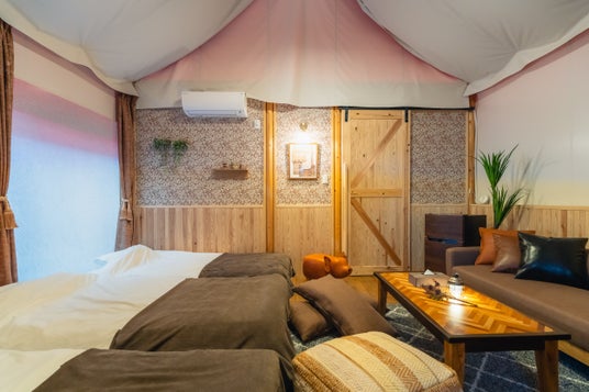 コテージとテントはどちらも冷暖房や浴室を含む水回りが完備されており、