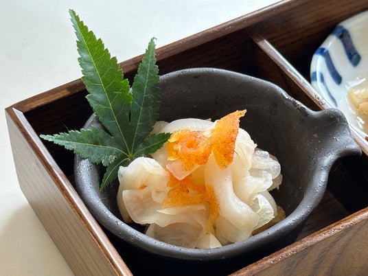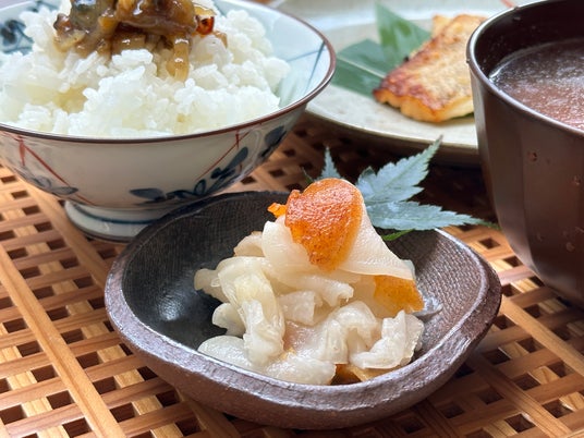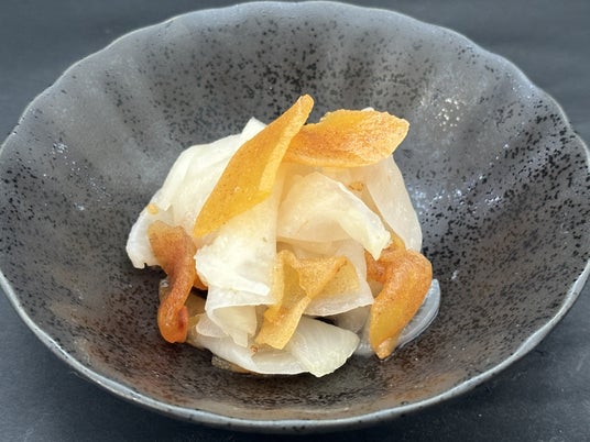 「岐阜県産富有柿と蕪の甘酢漬け」は、岐阜県産の富有柿と国産の蕪を使用し、酸味を抑えたまろやかで食べやすい甘酢漬けに仕上げました。柿の自然な甘さと蕪のさっぱりとした食感が絶妙に調和し、口当たりの良い一品となっています。