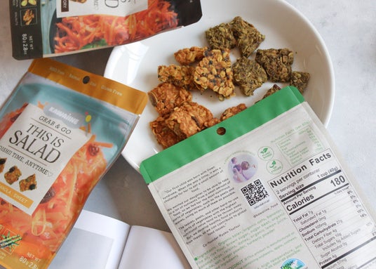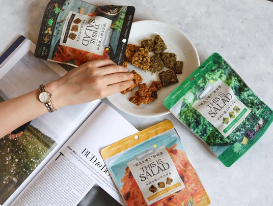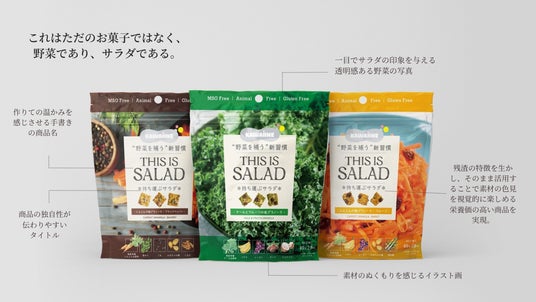 今回のラインナップではこの部分を「第三の朝食」とも言われるグラノーラや手軽に食べられるスナックとしてお届けしています。グラノーラやスナックの多くは主原料にオーツ麦や小麦が使われることが多いですが、「KAWAIINE」の「THIS IS SALAD」の主原料は野菜。「これはただのお菓子ではなく、野菜でもありサラダでもある」(This is not only snack, but THIS IS ALSO SALAD)であることを伝えるべく「THIS IS SALAD 持ち運ぶサラダ」と名付け、視覚的に伝わるよう野菜の写真や自然な色味を主体とし、陳列棚においても即座に商品の独自性が伝わるデザインにいたしました。