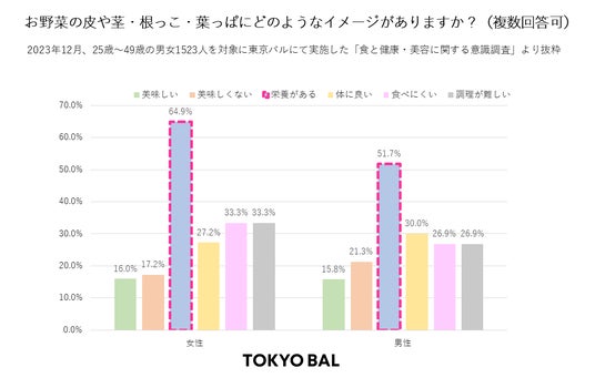 本商品の方向性を定めるにあたり、東京バルは、2023年12月に25歳から49歳を対象とした1,523名の男女を対象にアンケートを実施しており、その中で女性においては約64.9%、男性においても約51.7%の方が、「お野菜の?や茎・根っこ・葉っには栄養がある」と認識している一方、「調理が難しい」「食べにくい」と思われています。