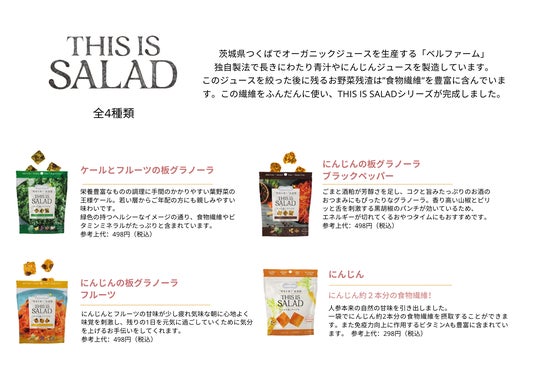 東京バルは、食物残渣の「栄養価」に注目しています。「THIS IS SALAD」は、茨城県の農業生産法人が手掛ける国産オーガニックジュースの残渣※3を用いており、この農場での野菜栽培から自社工場での優しく絞った生産まで一貫体制にのっとったこだわりのジュースの搾りかすには、食物繊維など沢山の栄養価が期待できます。これらのお野菜の部分を余すことなく多くの人に食べていただきたい、というベルファームの皆様の想いから商品開発がスタートいたしました。