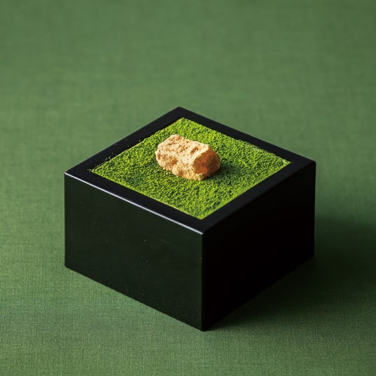 商品説明:枡にわらび餅、祇園辻利の抹茶餡、抹茶クリームを重ねました。たっぷりかかった祇園辻利の抹茶粉がリッチな大人デザート。