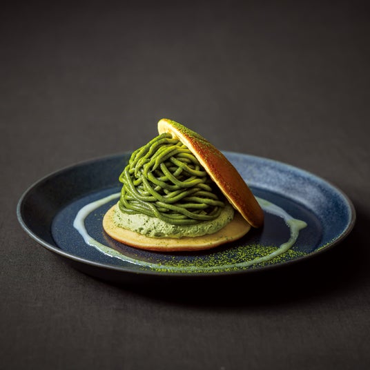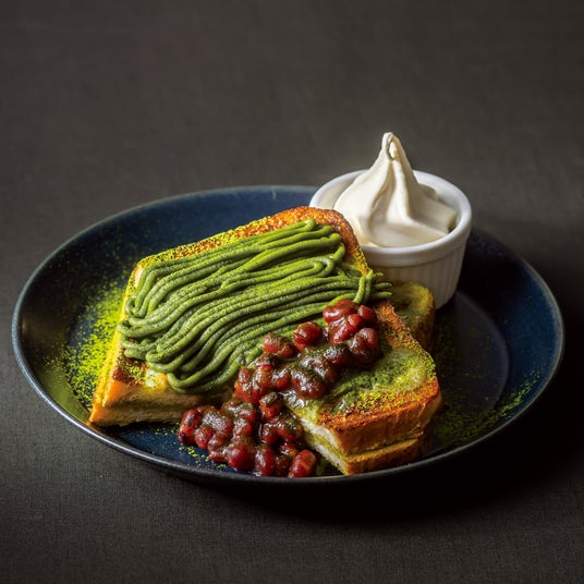 商品説明:抹茶ベースの卵液に浸して焼いたフレンチトースト。祇園辻利の抹茶シロップをたっぷりと。