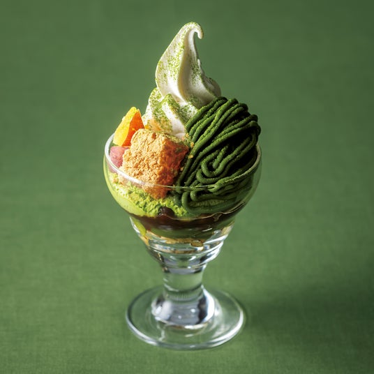 商品説明:祇園辻利の抹茶を使用したゼリー、ホイップ、シロップ、餡。柔らかわらび餅とさつま芋甘露煮を乗せました。