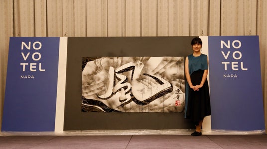 また、奈良と観光客を繋ぐSocial Hubとしての更なる発展を祈願し、奈良県知事 山下真氏、奈良市副市長 鈴木千恵美氏、奈良観光大使 辰?琢郎氏、公共投資顧問株式会社 専務取締役 長岡努氏、リアルアセット株式会社 代表取締役 久保西竜成氏、PGIMリアルエステート・ジャパン株式会社 Managing Director, Head of Japan David Fassbender(デイビッド・ファスベンダー)氏、Managing Director, 代表取締役 Morgan Aird Laughlin(モルガン・エアド・ラフリン)氏にもご出席を賜りました。会中では奈良市観光大使である妖怪書家 逢香氏による書道パフォーマンスも行われ、「ノボテル奈良さんのロゴの“N”という文字の上に、イノベーションを表す“はね”が記されています。このコンセプトのように“奈良の地に風を吹き起こす、旋風を巻き起こす”という想いで「風」の文字をしたためました。また、今回は文字を書くのではなく、「風」という文字の影を描くことで私自身も風を起こせたらと思い、このような作品にさせていただきました。」と作品への想いを語りました。そして、式の最後にはノボテル奈良が奈良の歴史と現代を未来へ紡いでいくという想いを込め、ノボテルのブランドカラーの青色と、青丹よしにちなみ緑色と朱色の「組紐」を結ぶ形でセレモニーが執り行われました。