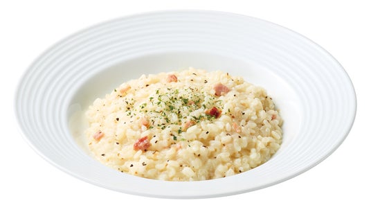 最も大事にしたのは、お米の粒立ち食感とソースの旨味です。お米は、現在販売中のライスメニューで使用している品種ではなく、リゾット専用米を使用することで張りが出るようにしました。チーズソースは、1時間じっくり炒めて甘味を出し、ピューレ状にした玉ねぎ、パルミジャーノチーズを使用しています。また、旨味や食感が最大限活きるよう、ベーコンを荒く砕いて合わせることで、深い味わいに仕上げました。