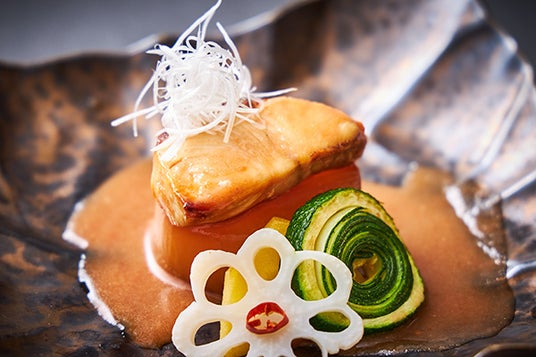 富山・石川・福井県産の恵みをさまざまな調理方法でご堪能いただける、ランチ限定のメニューです。八寸では、福井県産の“へしこ”をクリームチーズとクラッカーと一緒に、そのまま召し上がっていただけるように串にした一品や、エリンギを巻いて梅ペーストでさっぱりお召し上がりいただける富山県産“とやまポーク”をご用意いたします。揚物は石川県産の“加賀れんこん”をすりおろし、海苔を混ぜた衣で揚げる磯部揚げにすることで、モチモチの食感をお楽しみいただけます。福井県産の“とみつ金時”は相性のよい味噌を使ってグラタン仕立てにしました。グラタンの中には同じく福井県産の柔らかくジューシーな味わいの銘柄鶏“越前鶏”やきのこが入っており、様々な素材をご堪能いただけます。食事では、福井県産“ふくいサーモン”、石川県産”ゴマフグ“の昆布締め、北陸産”甘海老“、鮪を使った色鮮やかな「海鮮丼」をご賞味ください。