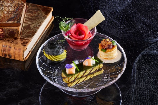 セイヴォリーでは、バンケットコールド・スーシェフ 森本雅夫がタプナードをサンドしたほうれん草の生地にクミン香るエビを合わせた「ほうれん草とエビのサンド」、ビーツでマリネしたサーモンをのせた「ビーツフランとサーモン ラボッシュ」など2人の魔法使いを彷彿とさせるアイテムとともに、栗を使ったボローバンなど旬の味わいを堪能できる全4種をお楽しみください。