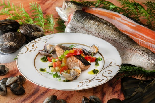 ・秋鮭のソテー 天然浅利のアーリオ・オーリオ(ディナー提供)