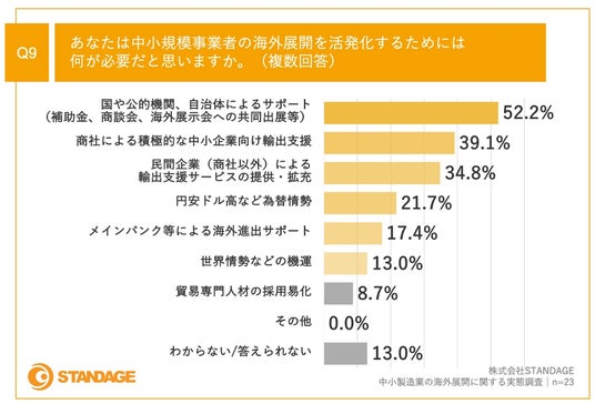 Q2で「行動を起こしていない」と回答した方に、「Q9.あなたは中小規模事業者の海外展開を活発化するためには何が必要だと思いますか。(複数回答)」(n=23)と質問したところ、「国や公的機関、自治体によるサポート(補助金、商談会、海外展示会への共同出展等)」が52.2%、「商社による積極的な中小企業向け輸出支援」が39.1%、「民間企業(商社以外)による輸出支援サービスの提供・拡充」が34.8%という回答となりました。