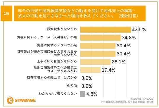 Q2で「行動を起こしていない」と回答した方に、「Q6.昨今の円安や海外展開支援などの動きを受けて海外売上の構築・拡大の行動を起こさなかった理由を教えてください。(複数回答)」(n=23)と質問したところ、「投資資金がないから」が43.5%、「貿易に関するリソース(人材含む)不足」が34.8%という回答となりました。