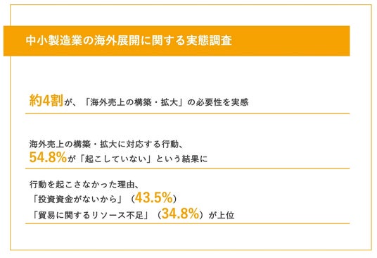今回の調査では、中小製造業において海外進出への意識が高まっている一方で、具体的な行動を起こしている企業は少数派であることが明らかになりました。行動を起こしている企業の多くが実感している販路拡大や、現地の商習慣への対応、契約時の懸念に対し、さらなる支援策の充実が求められます。中小製造業の海外展開を成功に導くためには、国の支援策の拡充および認知の向上はもちろんのこと、国と民間が連携して支援・サービスの充実をはかり、中小製造業がスムーズに海外進出ができる土壌の形成に努めることが効果的でしょう。