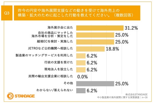 Q2で「行動を起こした」と回答した方に、「Q3.昨今の円安や海外展開支援などの動きを受けて海外売上の構築・拡大のために起こした行動を教えてください。(複数回答)」(n=16)と質問したところ、「海外展示会に出た」が31.2%、「自社の商品にマッチした海外市場を分析・策定をした」が25.0%、「越境ECを検討・実施した」が25.0%という回答となりました。