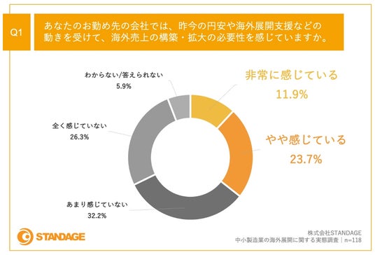 「Q1.あなたのお勤め先の会社では、昨今の円安や海外展開支援などの動きを受けて、海外売上の構築・拡大の必要性を感じていますか。」(n=118)と質問したところ、「非常に感じている」が11.9%、「やや感じている」が23.7%という回答となりました。