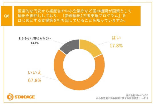 「Q8.あなたは、恒常的な円安から経産省や中小企業庁など国の機関が国策として輸出を後押ししており、「新規輸出1万者支援プログラム」をはじめとする支援策を打ち出していることを知っていますか。」(n=118)と質問したところ、「はい」が17.8%、「いいえ」が67.8%という回答となりました。