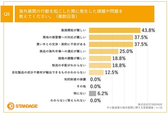 Q2で「行動を起こした」と回答した方に、「Q5.海外展開の行動を起こした際に発生した課題や問題を教えてください。(複数回答)」(n=16)と質問したところ、「販路開拓が難しい」が43.8%、「現地の商習慣への対応が難しい」が37.5%、「買い手との交渉・契約に不安がある」が37.5%という回答となりました。