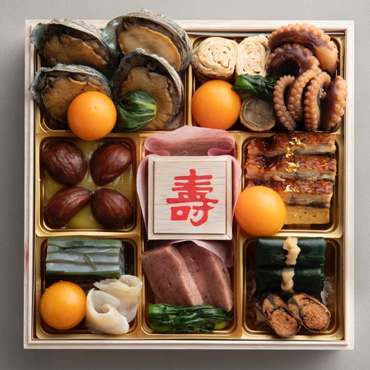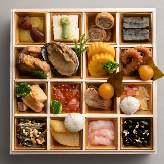 あわび旨煮/焼き目巻湯葉煮/穴子八幡巻/蛸旨煮/渋皮栗甘露煮/きんとん/壽珍味入に福(ふぐ)うに和え/鰻柳川真薯金箔/鯛博多昆布〆/小鯛笹漬け/京都赤しそ生麩梅風味煮/昆布巻煮/子持鮎甘露煮 など