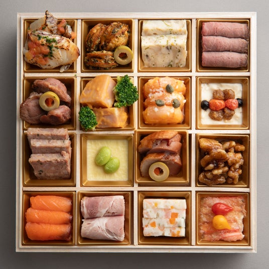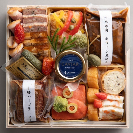 JR西日本ホテルズの和食・洋食それぞれのスペシャリストが監修し、昨年から内容を一新した今年一押しのおせち料理です。本格的な味わいはもちろんのこと、昨年より10品目を増やした53品目とボリュームたっぷりな内容は親子3世代でもお楽しみいただけます。壱の重・弐の重には、「あわび旨煮」や「福(ふぐ)うに和え」など、伝統の和のおせち料理を彩り豊かに。参の重には「ローストビーフ」や温めてお召し上がりいただく「牛ホホ肉赤ワイン煮込み」をはじめ、「キャビア」、「トリュフバターパン」など、ホテルらしく華やかな洋食を取り揃えました。