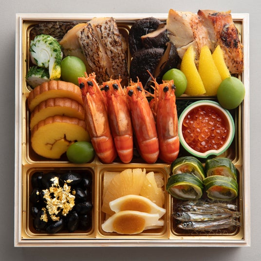 真鯛柚庵焼き/烏賊わらび仕立て/金目鯛西京焼/伊達巻/海老旨煮/竹猪口いくら醤油漬け/黒豆蜜煮金箔/数の子/本唐墨印籠焼/のどぐろ広島菜巻/田作り煮 など