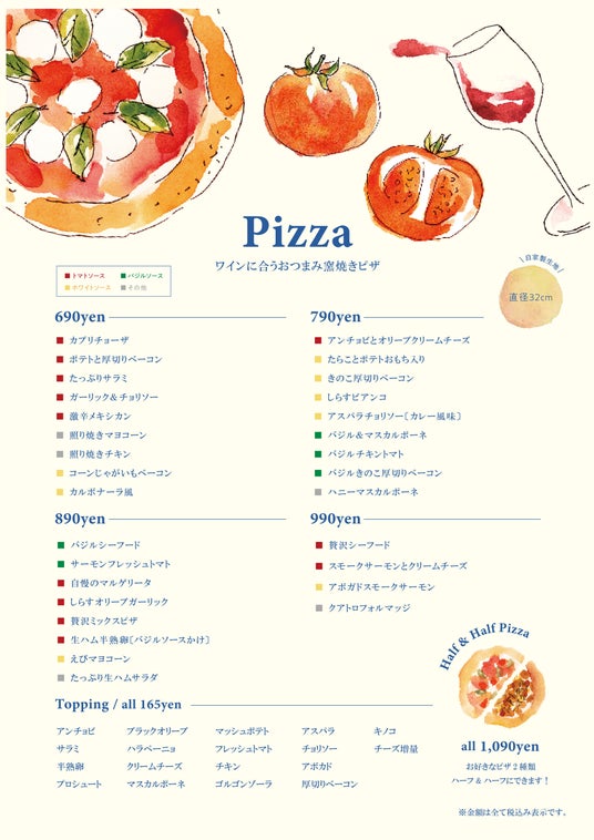 毎日生地から手作りする自家製窯焼きピザは1枚690円(税込)~とリーズナブルなお値段のものも合わせ、30種類をご用意しております。