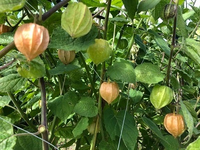 食用ほおずきは一年草で毎年種を蒔くところから始まります。15センチほどの苗になってから畑に定植します。支柱を立てたり枝を紐で吊ったりしながら丈は150センチほどになります。夏の暑い日の作業は汗だくでとても辛く、秋の収穫は手作業の摘み取りでしゃがんだり立ったりと、かなり過酷な作業が10月下旬まで続きます。大変な農作業ですが皆様からの「美味しい」の一言が支えとなりスタッフ一同頑張っています。今回このようなイベントを企画していただきましたことを心より感謝いたしますとともに、なお一層栽培に励み白馬村をさらに盛り上げていきたいと思っています。