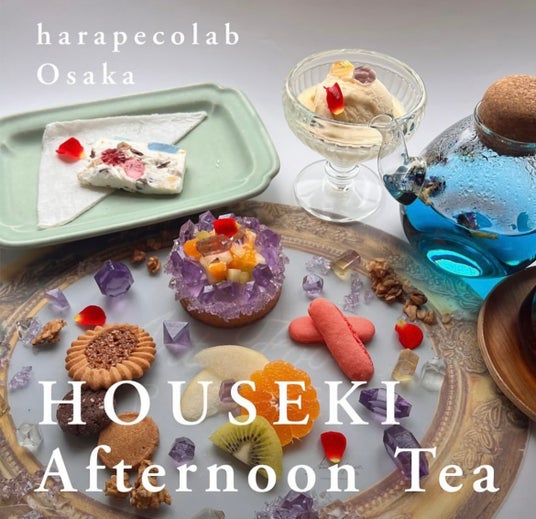 ハラペコラボ大阪店の人気メニュー【宝石アフタヌーンティー】(予約制)などカフェメニューでも鉱物を存分に味わうことができる