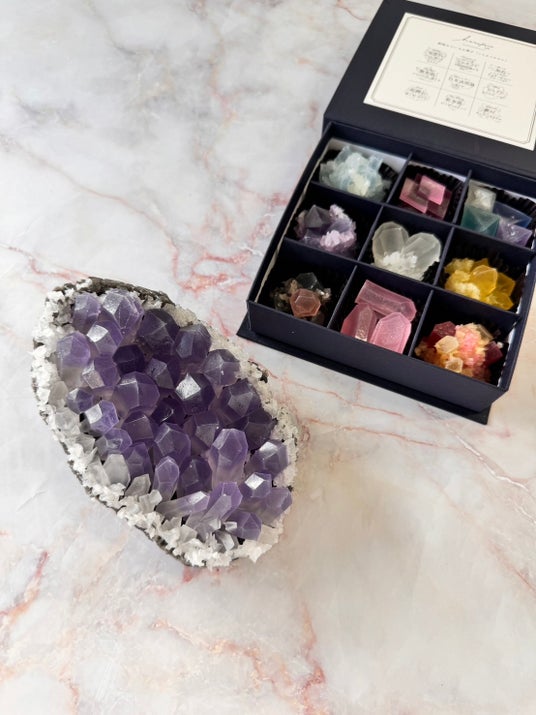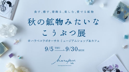 ハラペコラボ大阪店が、2024年9月5日より【 秋の鉱物みたいなこうぶつ展 】の開催をスタートした。鉱物や宝石をモチーフとした琥珀糖“こうぶつヲカシ”を中心に、<天然石アクセサリー>、鉱物をモチーフにした<石鹸>や<キャンドル>、そして、<イラスト、雑貨>が店内に並ぶ。
