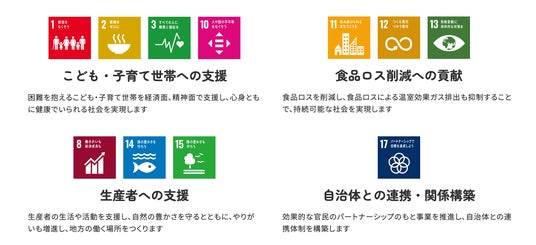 支援のなかで、規格外野菜・未利用魚や企業の食品ロス予備軍の商品も活用することで、食品ロスを削減します。また、廃棄食品を燃焼することで発生する温室効果ガスの排出も抑えることで、持続可能な社会を実現します。