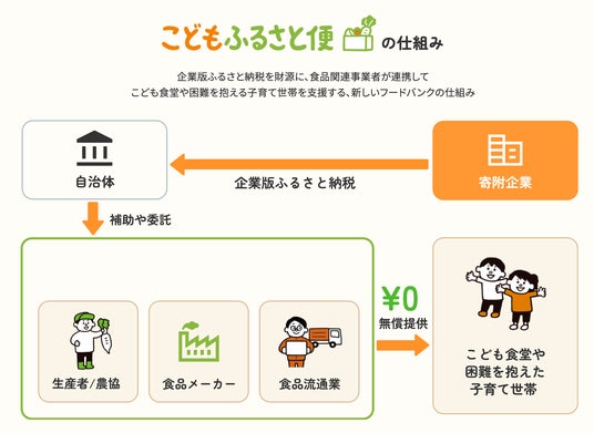 ネッスー株式会社(本社:東京都世田谷区、代表:木戸優起)は、企業版ふるさと納税を活用した新しいフードバンク事業「こどもふるさと便」を正式に開始します。本事業は、企業版ふるさと納税を財源として自治体と食品関連事業者が連携し、こども食堂や困難を抱えるこども・子育て世帯を支援する、新しいフードバンクの仕組みです。当社は、この事業を通じて、社会課題となっているこどもの食の格差だけでなく、同時に食品ロス削減の実現を目指します。