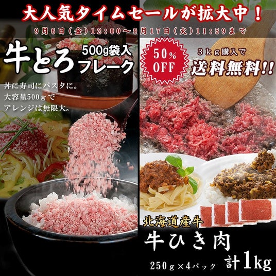 大人気タイムセールが期間拡大週末しか購入できないタイムセール商品が、期間中いつでも購入可能に!牛とろフレーク500gはたっぷり25杯分、牛ひき肉は使いやすい250g×4パックのセット。他商品との同梱も可能。