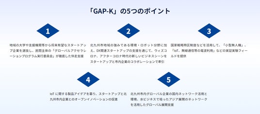 北九州市では産学官の連携のもと、環境、ロボット、DX(デジタルトランスフォーメーション)等の分野を中心にスタートアップ企業を発掘、育成し、新たな産業を創出するとともに、ビジネスによる SDGs 未来都市の実現を目指しています。今回、地域に根ざした民間主体のプログラム「グローバルアクセラレーションプログラム(通称:GAP-K)」の採択企業4社が決定しました。