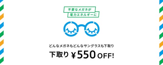 - 内容|¥3,300以上のメガネ、サングラス、パッケージ商品等を購入の際、不要になったメガネ、サングラスの下取りで¥550値引き ※Zoff以外のメガネやサングラス、壊れたメガネも対象です。