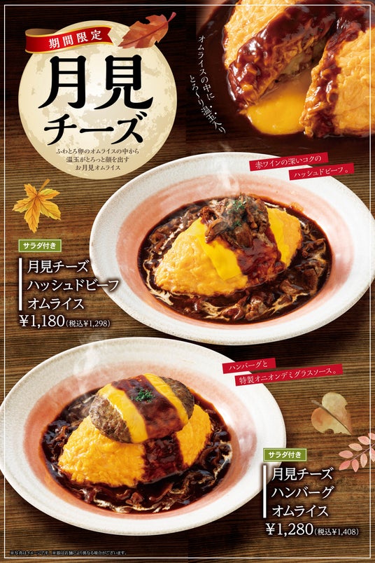 独自手法で卵・空気・油を混ぜ合わせることによって卵そのものの美味しさを丁寧に引き立てる“ふわとろオムライス”の「おむらいす亭(レストラン店舗)」では9月4日(水)より11月30日(土)までオムライスの中から温玉がとろっと出てくる秋の限定メニュー「月見チーズ」のオムライス2種類をサラダ付きで販売しています。「赤ワインの深いコク」が特徴の月見チーズハッシュドビーフオムライスと「ハンバーグと特製オニオンデミグラスソース」を使用した月見チーズハンバーグオムライス。どちらも、半熟の黄身とチーズの風味と共にお召し上がりください。また、今回は10月4日(金)までフェアメニューご注文のお客様にドリンク1杯サービス致します。どうぞ、この機会にご利用ください。皆さまのご来店をスタッフ一同お待ちしております。