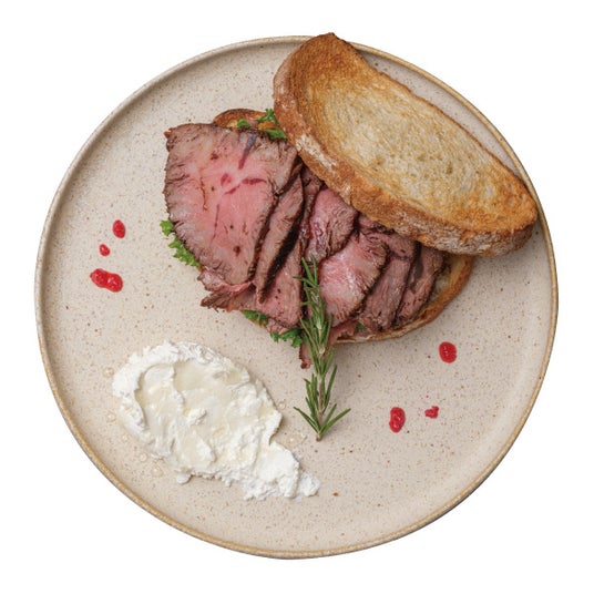炭火ローストビーフサンド満足感たっぷりのボリューミーなビーフサンド。国産牛ミスジのやわらかさ、国産牛ならではの霜降りですっきりとした脂身、唯一無二の塩味と鼻に抜ける炭火の香りがたまりません。焼肉屋のタレを使った& Yogurtオリジナルソースをかけ、B-カロテン・ビタミン・カリウム・カルシウム・ミネラルが豊富なケールをカンパーニュで挟んでいます。添えたグリークヨーグルトとともにお楽しみください。