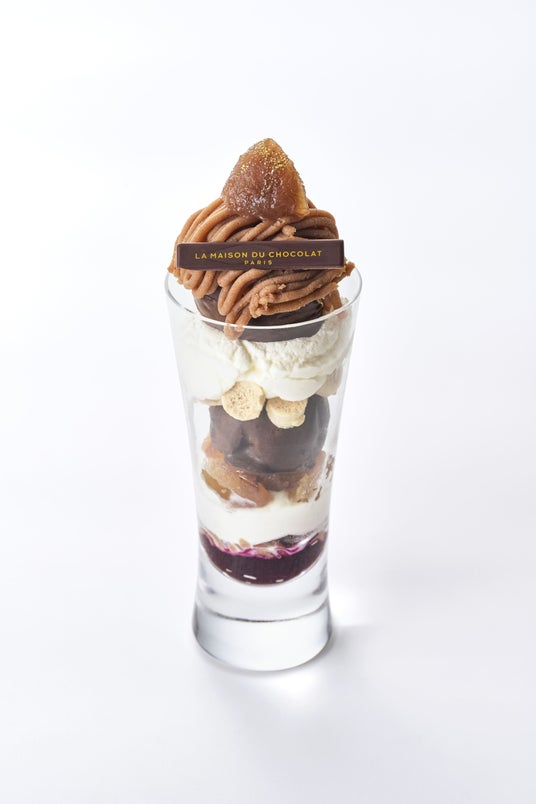 マロンのクリームとコンフィ、ショコラアイスに、シャンティ―、シナモン風味のメレンゲ、カシスソースを合せたパフェ。甘味のある濃厚なマロンとショコラアイスが、まろやかなクリームと甘酸っぱいカシスと調和し、メレンゲが食感と風味のアクセントに。マロンの風味を楽しむ秋らしい濃厚な味わい。