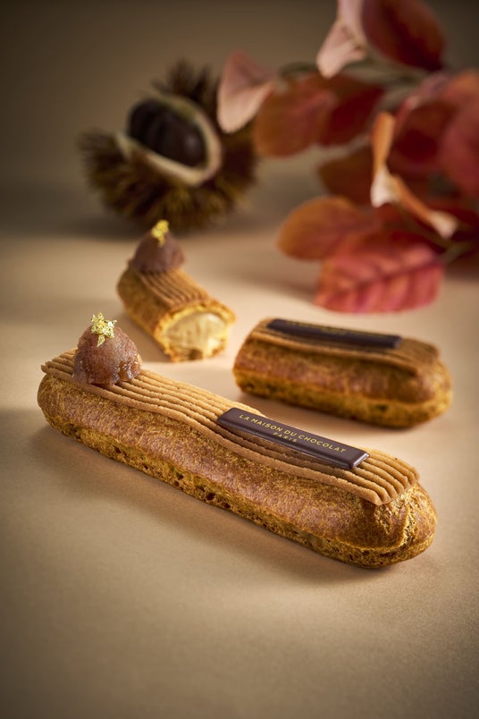 ラム酒入りのマロンクリームをたっぷり詰め、トップには洋ナシ風味のマロンクリームを絞りマロンのコンフィを飾ったエクレール。