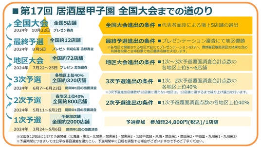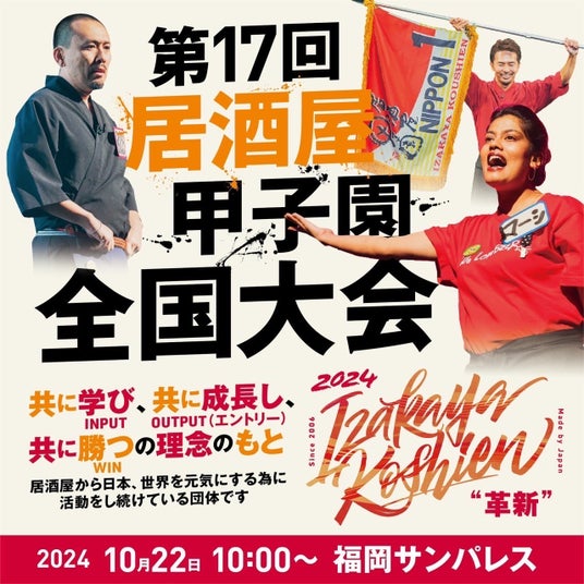 「第17回 居酒屋甲子園全国大会」は、NPO法人居酒屋甲子園(所在地:東京都 /理事長:氏田善宣)が主催する“居酒屋から日本を、世界を元気にする”という想いを持つ全国の同志により開催された、外食業界に働く人がより誇りを持ち、学びを共有できる場を提供する大会です。 全国からエントリーされた居酒屋のうち、独自の選考基準で選ばれた優秀店舗(5店舗)と優秀店長(2名)が、年一回、全国大会に集結します。