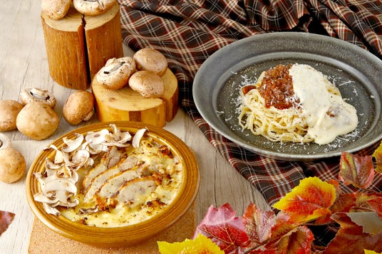 写真左◆六甲シャンピニオンとローストした鶏のクリームソースパスタ グラタン仕立て