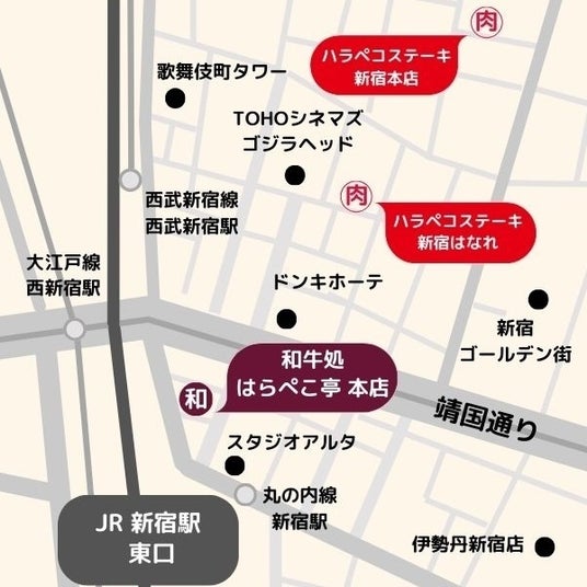 アクセス:JR新宿駅東口より徒歩2分(新宿東口の猫の裏)、西武新宿線西武新宿駅より徒歩3分
