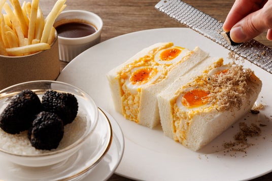 本商品は、高さ9mのパノラマウィンドウから浅間山を真正面に望める軽井沢町内でも特に眺望の良い軽井沢 浅間プリンスホテルのレストラン「ダイニング ブルーム」にて提供します。卵は、高級感のある褐色の厚い卵殻と、箸でつかめる濃厚な卵黄が特徴で、長野県知事賞を受賞した唯一の赤鶏卵「浅間小町」を使用。お客さまの目の前で食欲をそそる香りのフレッシュトリュフをたっぷりと削って仕上げます。さらに、フライドポテトに付けるマデラ酒を使用したトリュフソースをたまごサンドへかけることでフランス料理のような味わいに変わります。ペアリングには、少しボリュームのあるリッチなシャルドネワインがよく合います。