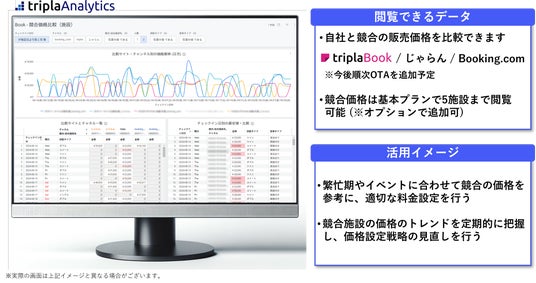 宿泊施設向けITソリューションを展開するtripla株式会社(本社:東京都新宿区、代表取締役CEO 高橋 和久、代表取締役CTO 鳥生 格、以下「トリプラ」)は、5月よりベータ版として提供していたデータ可視化サービス「tripla Analytics」に、競合価格比較が可能な機能などを追加し、本格的に提供を開始することをお知らせします。