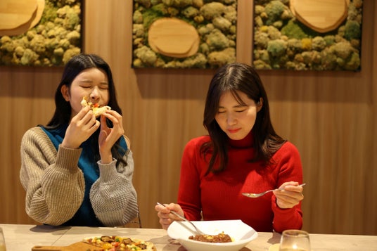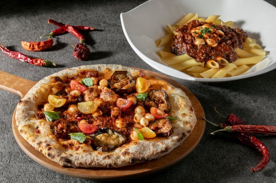 1. 「ザ・ステーション カフェバー」にて『麻婆風“激”辛ピザ』または『“激”辛ボロネーゼ』より選べる“激”辛メニューとパチパチドリンクでまずは食欲を刺激。