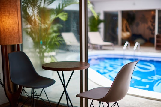 まるで海外にあるモーテルのような造りをした 8HOTEL CHIGASAKI。プールを囲うようにフロント、ラウンジ、サウナなど、非日常な空間が広がります。サウナやプールだけではなく、併設のラウンジで軽食を楽しんだり、ととのいスペースでゆっくり話したり、あなたらしく自由に寛ぎ、チルな時間をお楽しみください。夜はライトアップで別の顔を見せ、ナイトプールとしてもお楽しみいただけます。