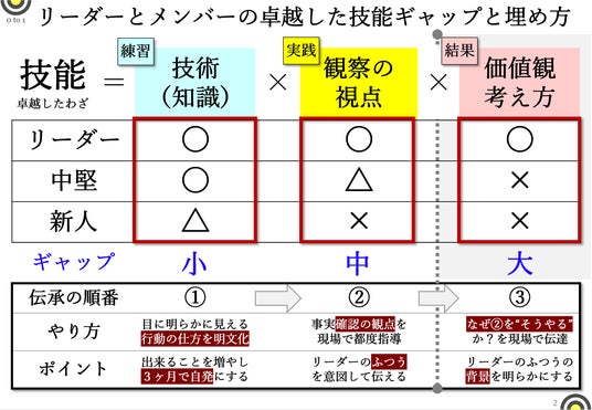 - 技能伝承の3要素に基づいた体系化:卓越した技能は、「価値観・考え方」「観察力」「技術」の3つの要素が相互に作用し合うことで初めて成立します。このアプローチでは、この3つの要素を組織の現場に応じて段階的に伝承し、最適なタイミングで社員が自発的に技能を習得できるように支援。