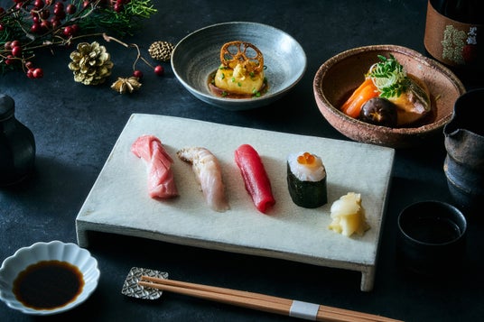 日本で過ごすクリスマス、今年は和食とともに上質なひとときを楽しんでみてはいかがでしょうか。ホテル最上階、8席限定の大人の隠れ家、the SUSHIでは国内外で多くの経験を積んだ料理長 中村 栄治が手掛ける、旬の鰤やのどぐろなど北陸産の食材をふんだんに使用したクリスマス限定のコース。日本酒3種のペアリングとともにお楽しみいただけます。北陸産魚介を中心としたおまかせの本格江戸前寿司の握り8貫を含む、食材本来の旨味をシェフの技術で魅せる豪華なディナーコースで、例年とはひと味違う和の心を大切にした聖なる夜をお過ごしください。