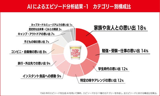 お寄せいただいたエピソードをカテゴリー毎に分類したところ、「家族や友人との思い出」が18%で1位となり、「カップヌードル」は誰かと一緒にいる時に食べられている傾向が強いことが分かりました。「家族や友人との思い出」にまつわるエピソードの中には、『元日の昼食には必ず「カップヌードル」を食べる! という“我が家の習慣”が、祖父母から孫へ受け継がれています』といったものもあり、半世紀以上の歴史を持つ「カップヌードル」ならではの世代を超えた思い出をお持ちの方もいらっしゃいました。