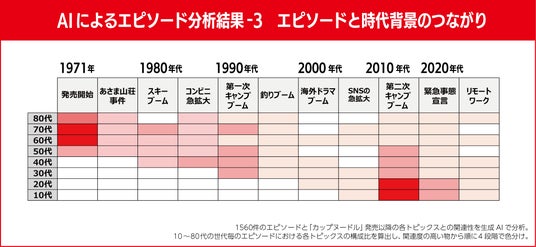 それらのエピソードの傾向を生成AIで分析したところ、「カップヌードル」とお客さまとの関係性の歴史を垣間見ることができました。