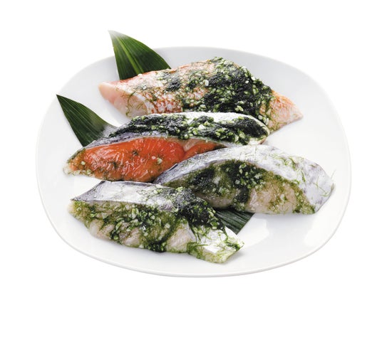 【三越伊勢丹限定】<魚勢>すじ青のりと塩麹ダレの漬魚(サワラ 756 円・銀鮭 648 円・赤魚 540円)