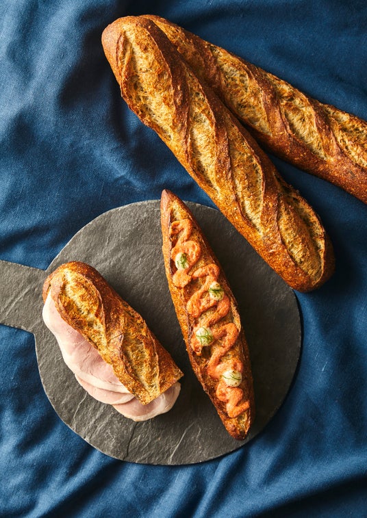 【伊勢丹新宿店限定】<PLUSOUPLE(プラスプレ)>鎌倉熟成ももハムのすじ青のりバゲットサンド 983円すじ青のり明太バゲット 605円 すじ青のりバゲット 486円